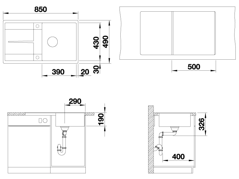 Размер мойки 850 х 490 мм, размер чаши: 390 х 430 мм, установка: в один уровень со столешницей, материал: искусственный гранит, цвет: темная скала.