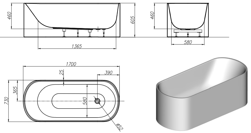 170 X 73 см, литраж - 285 л. Овальная отдельностоящая ванна. Материал - акрил. Комплектация Basis: ванна, каркас, панель, сифон.