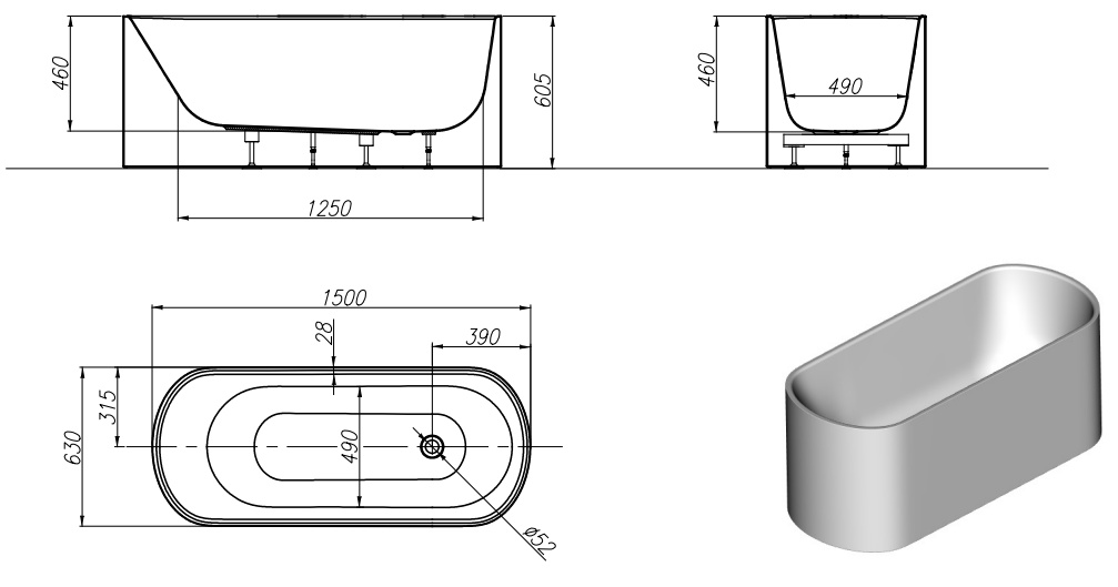 153 X 63 см, литраж - 200 л. Овальная отдельностоящая ванна. Материал - акрил. Комплектация Basis: ванна, каркас, панель, сифон.