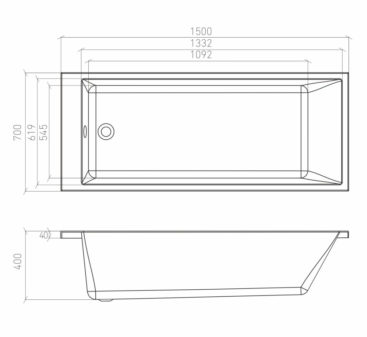 Параметры - 150 x 70 см, глубина - 41 см, объем до перелива - 150 л.