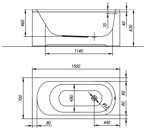 150 X 70 см, литраж - 180 л. Прямоугольная ванна классической формы. Материал - акрил. Комплектация: ванна без каркаса, без панели.