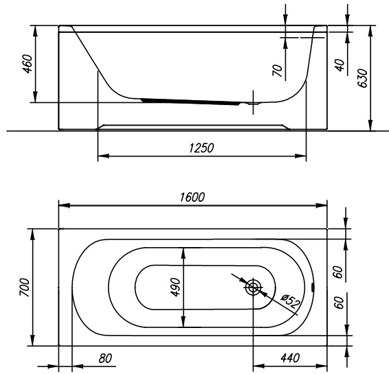 160 X 70 см, литраж - 200 л. Прямоугольная ванна классической формы. Материал - акрил. Комплектация: ванна без каркаса, без панели.