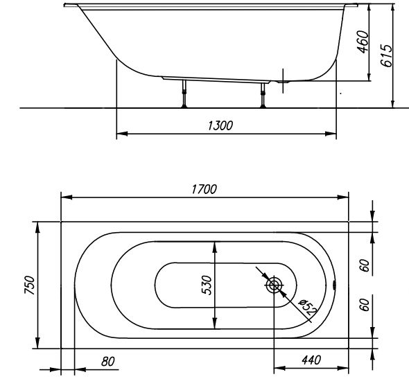 170 X 75 см, литраж - 235 л. Прямоугольная ванна классической формы, предназначена для встройки в подиум. Материал - акрил. Комплектация: ванна без каркаса, без панели.