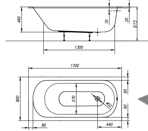 170 X 80 см, литраж - 245 л. Прямоугольная ванна классической формы, предназначена для встройки в подиум. Материал - акрил. Комплектация: ванна без каркаса, без панели.