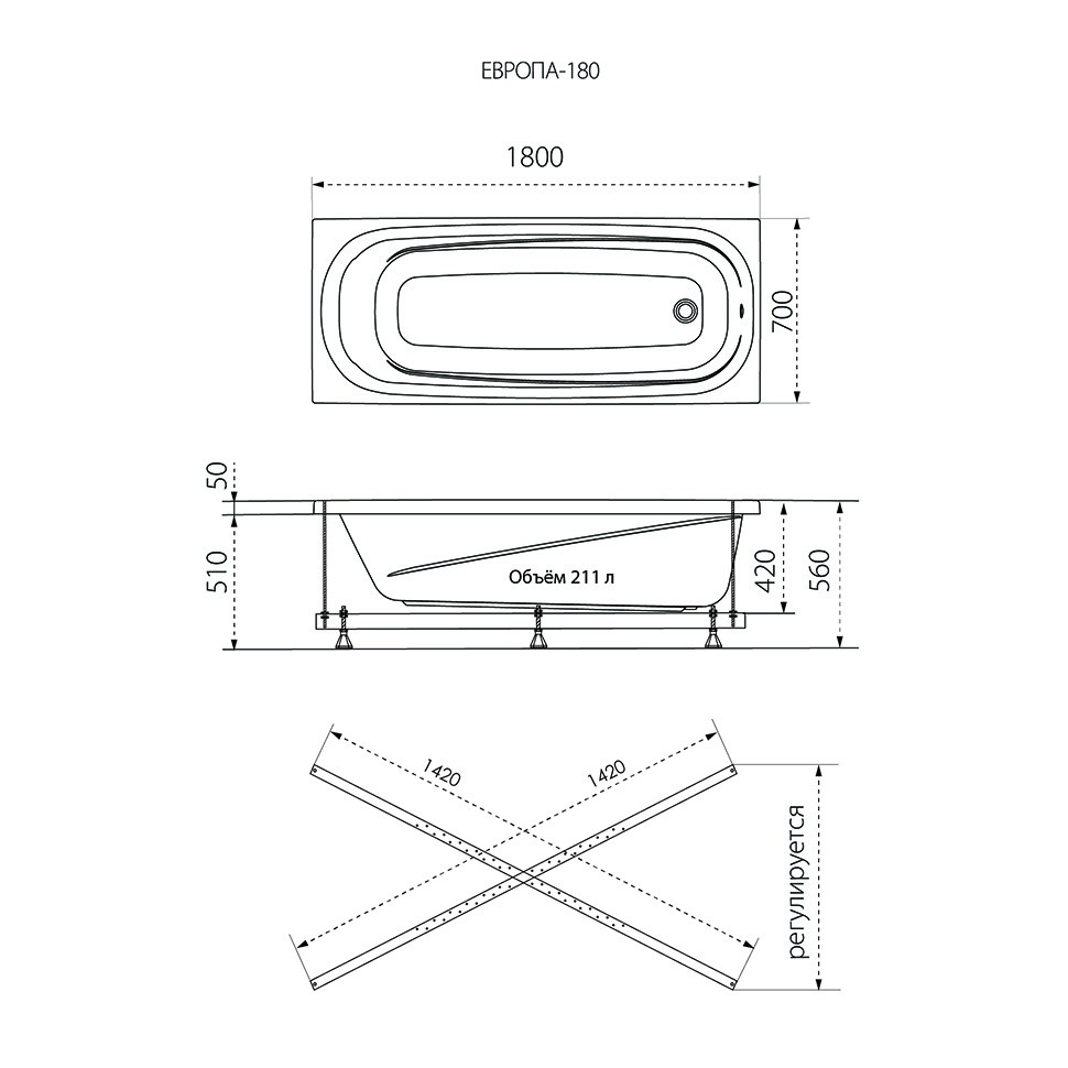 180 х 70 см, литраж - 211 л. Комплектация: ванна ножки, каркас отдельно. Материал - акрил.
