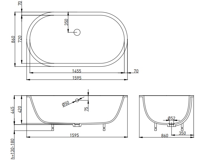159,5 x 86 см. Без перелива, цвет белый матовый (белый глянец). Ванна для встраивания или облицовки в комплекте с ножками. Каменная масса Soft Rock.