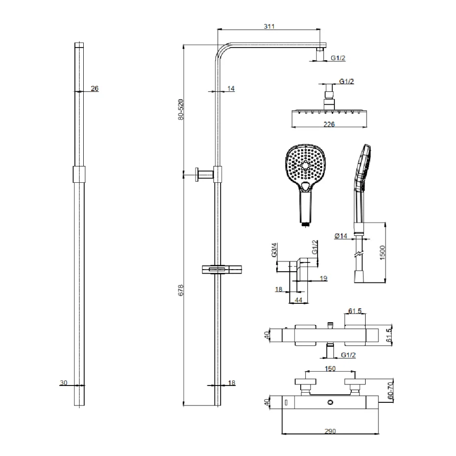 верхний душ, ручной душ, термостатический смеситель для душа, штанга для душа, держатель для душа;