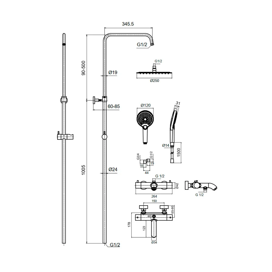 верхний душ, ручной душ, термостатический смеситель для ванны, штанга для душа, держатель для душа;