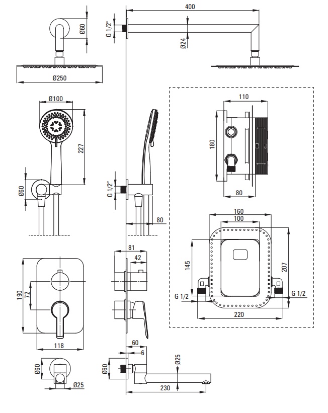 Для скрытого монтажа. Верхний душ со стены 250 мм, поворотный излив 230 мм. Картриджный смеситель. Ручной душ на 3 режима. Функция очистки от водного камня. Цвет: титан.