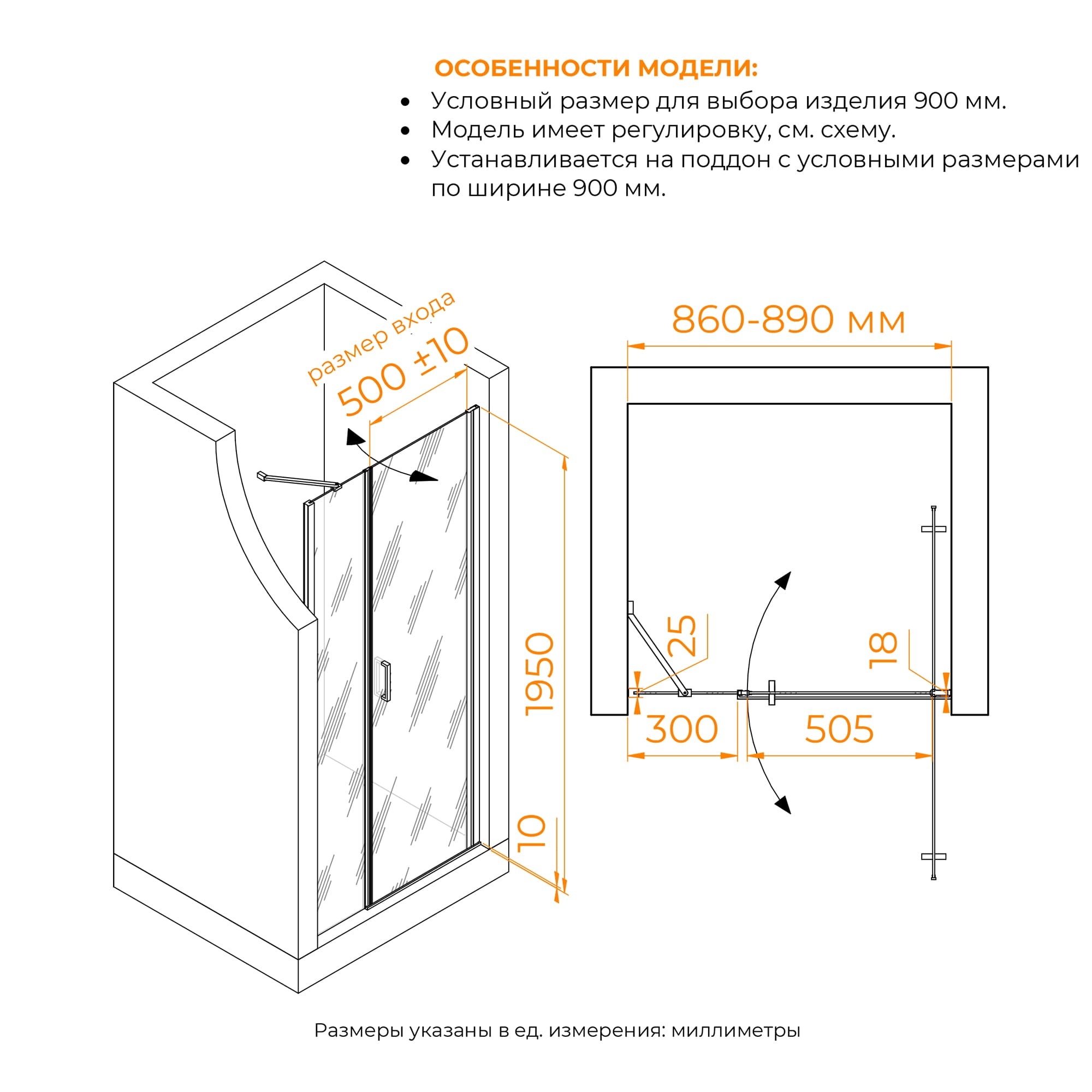 Душевая дверь изготовлена из стекла толщиной 6 мм, обеспечивающего превосходную прочность и долговечность. Прозрачный цвет стекла создает современный и открытый вид, а хромированный цвет профиля добавляет нотку элегантности. Общая высота двери составляет 1950 мм, что делает ее подходящей для большинства стандартных душевых кабин.