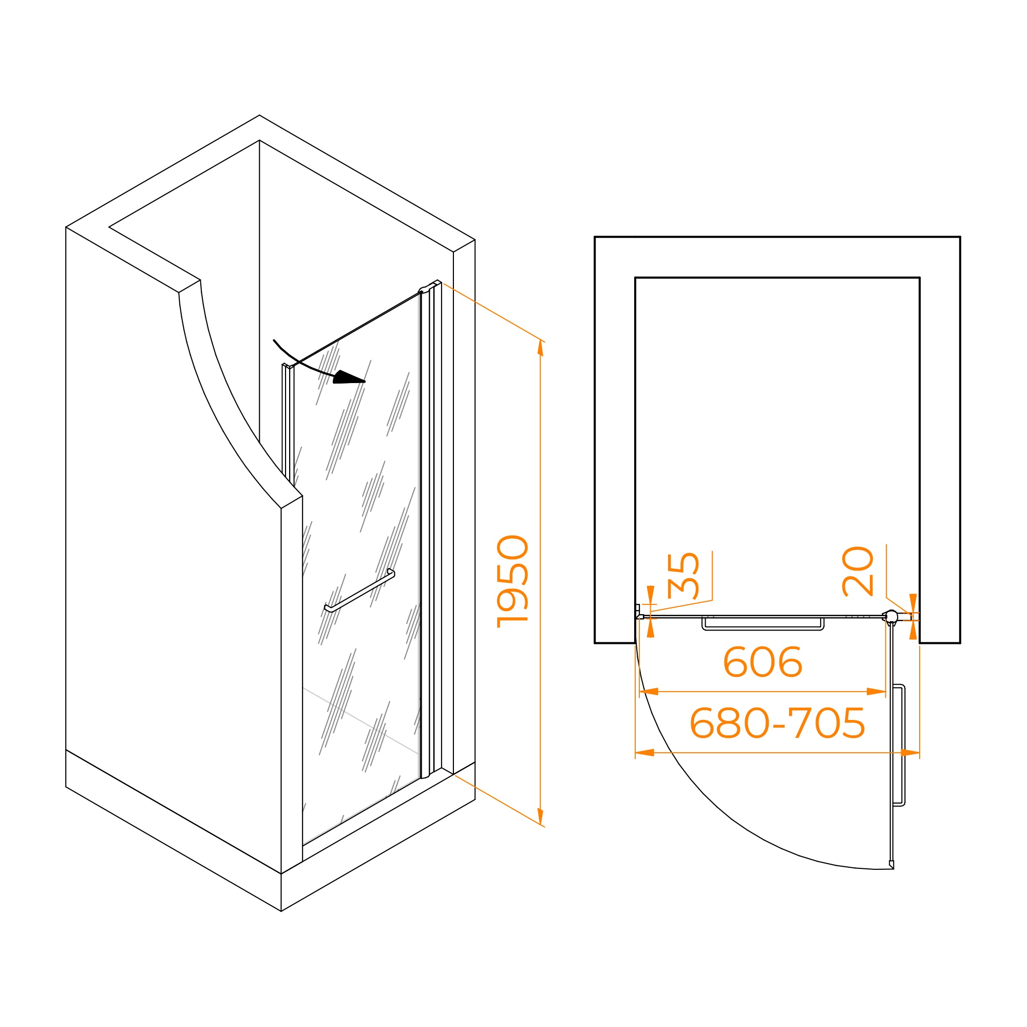 Душевая дверь распашная с маятниковой петлей (открытие только наружу или только внутрь). Маятниковые петли с функцией подъема двери. В комплекте нижняя пороговая планка. Стальная ручка - полотенцедержатель. Трап или поддон приобретается отдельно.