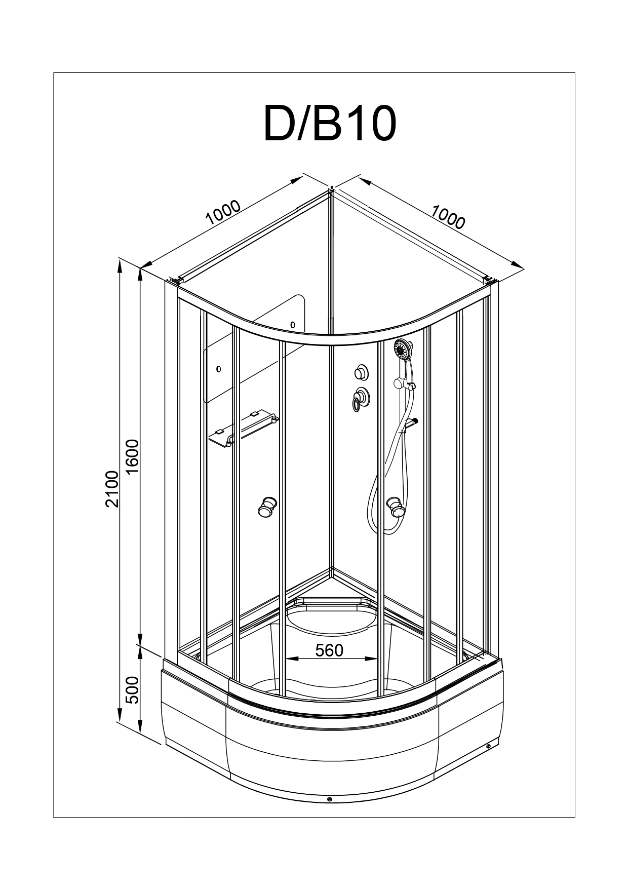 Размер: 100x100x208 см. Высокий поддон 50 см. Ручной душ: Есть, верхний душ: нет, баня: нет. Стекло каленое 4 мм матовое, профиль хром.