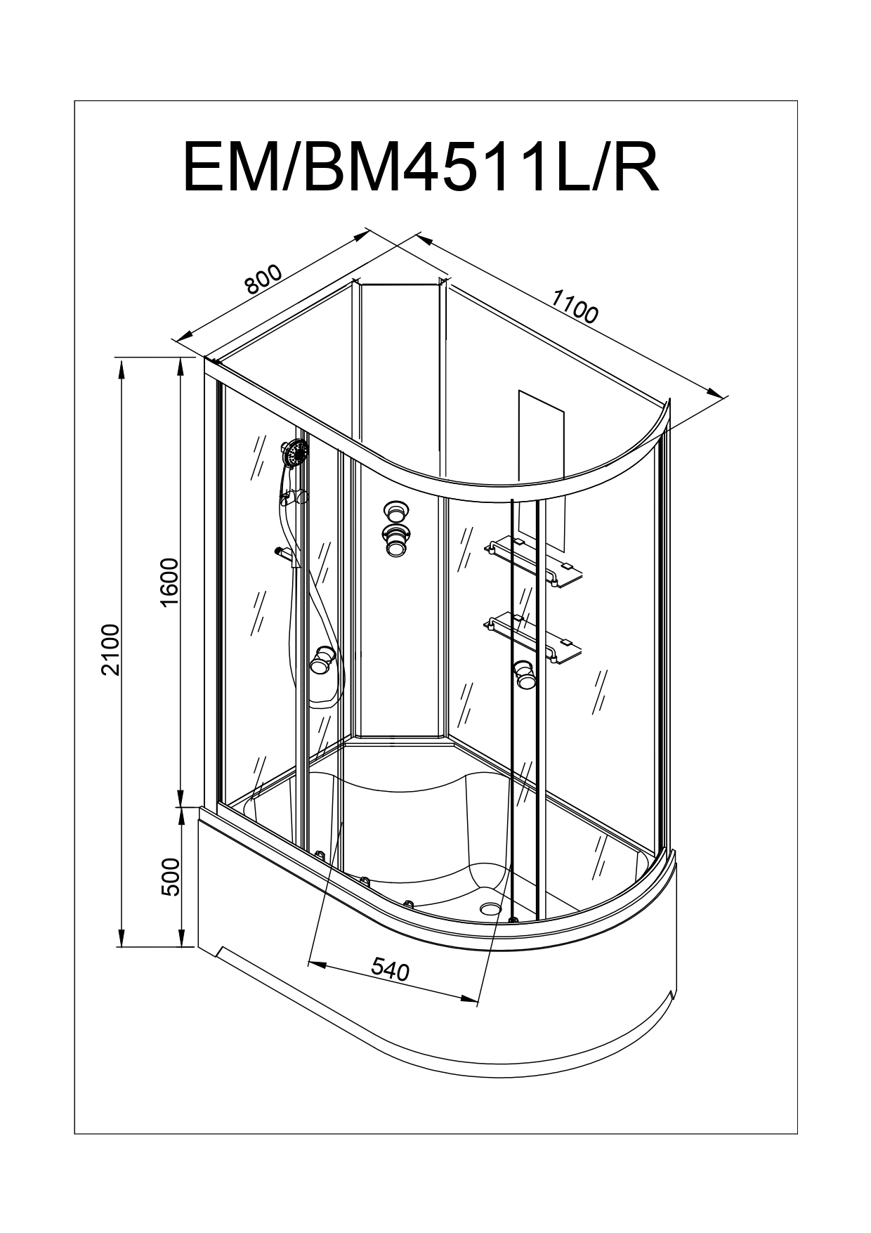 Размер: 110x80x208 см. Высокий поддон 50 см. Ручной душ: Есть, верхний душ: нет, баня: опция. Стекло каленое 5 мм с узором, профиль хром.