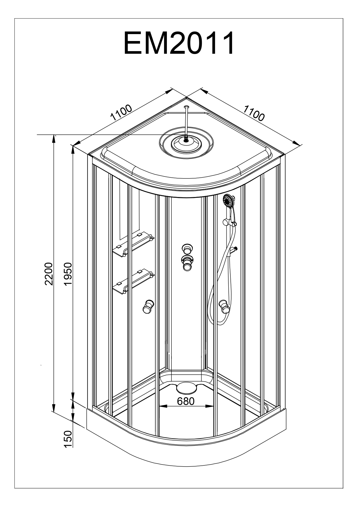 Размер: 110x110x220 см. Низкий поддон 15 см. Ручной душ: Есть, верхний душ: есть, баня: опция. Стекло каленое 5 мм с узором, профиль хром.