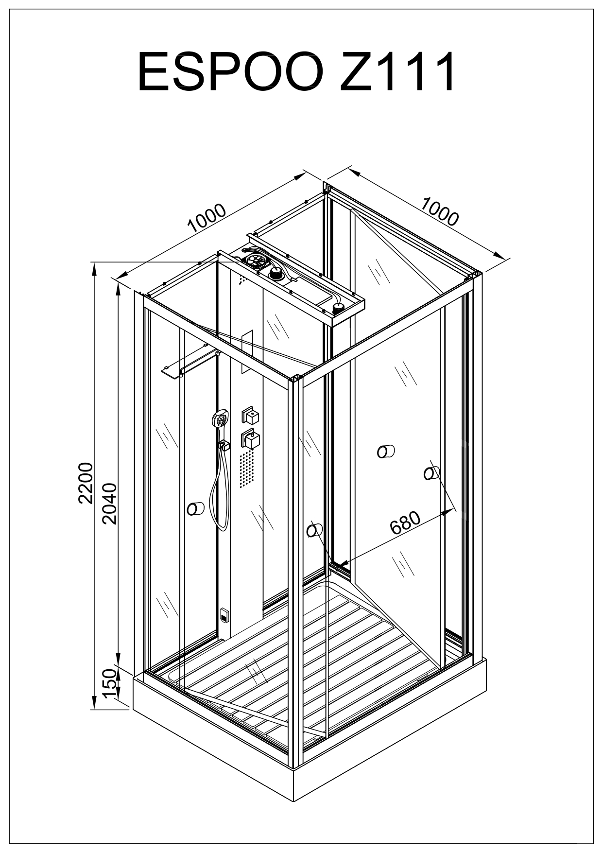 Размер: 100x100x220 см. Низкий поддон 15 см. Ручной душ: Есть, верхний душ: есть, баня: опция. Стекло каленое 6 мм прозрачное, профиль хром.