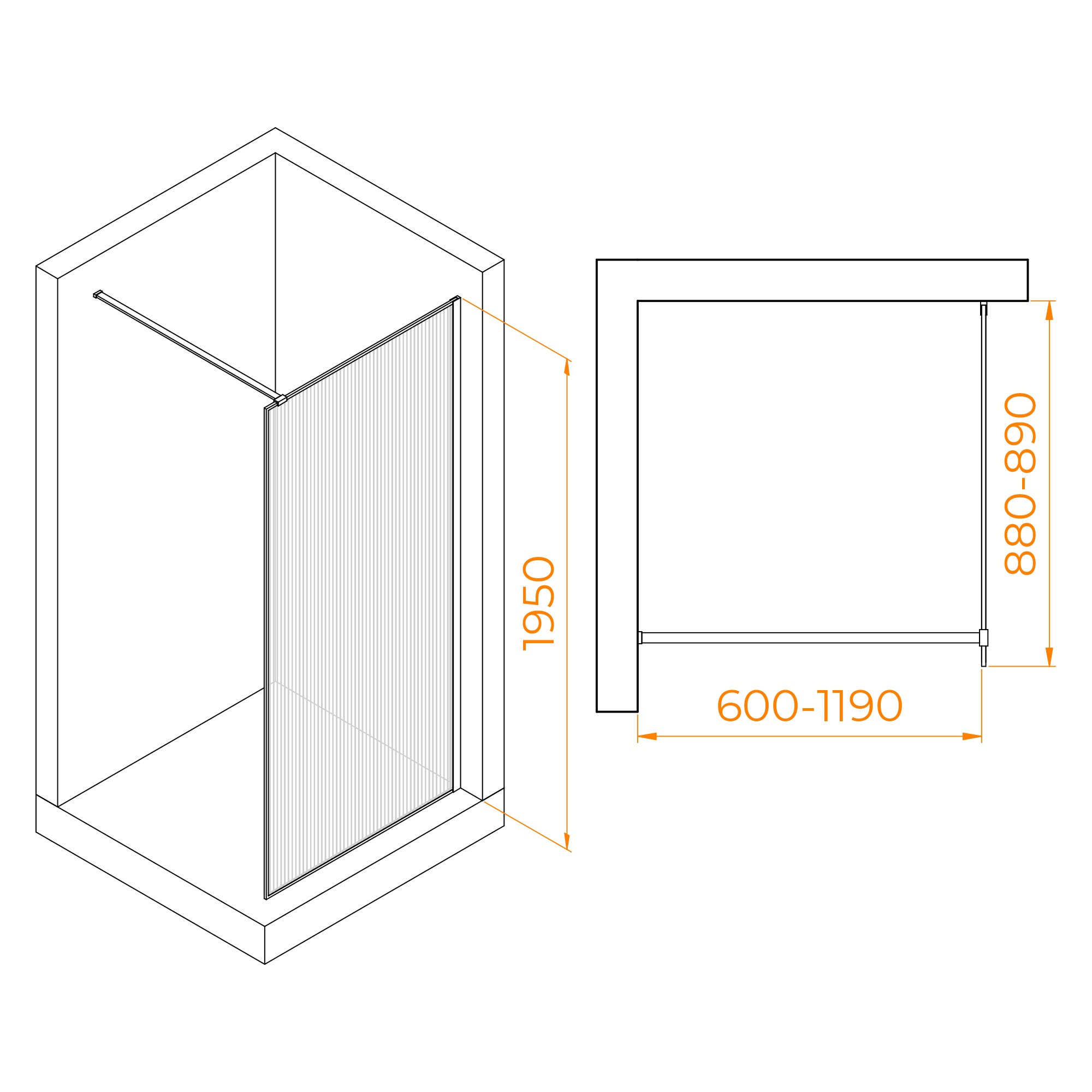 Эта стеклянная душевая перегородка высотой 1950 мм создает уникальное душевое пространство, визуально увеличивая площадь ванной комнаты. Конструкция крепится к стене с помощью пристенного соединительного профиля и штанги держателя.