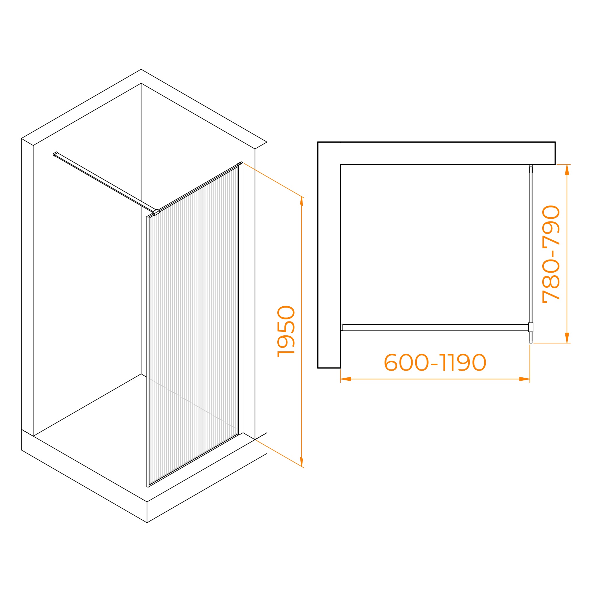 Эта стеклянная душевая перегородка высотой 1950 мм создает уникальное душевое пространство, визуально увеличивая площадь ванной комнаты. Конструкция крепится к стене с помощью пристенного соединительного профиля и штанги держателя.