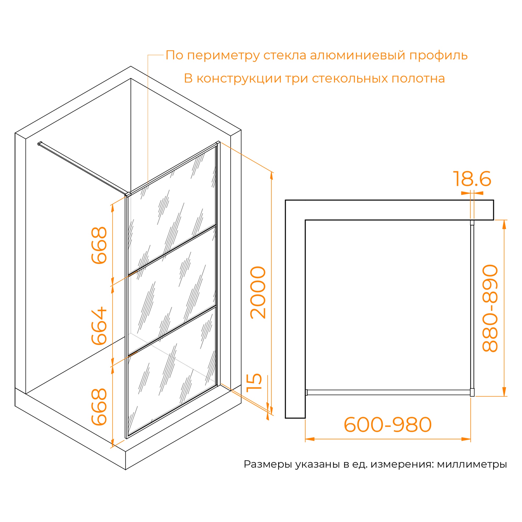 Угловой монтаж. Ширина 88-89 см, высота 200 см. Материал - закалённое стекло 8 мм Ribbed (ребристое), Easy Clean. Профиль - черный.