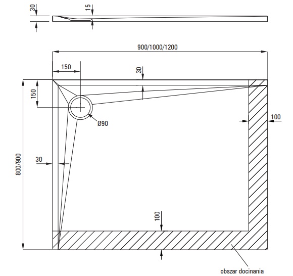90x100x3 см. Неглубокий самонесущий поддон с установкой на стяжку. Отверстие для сифона 90 мм. Материал - акрил.