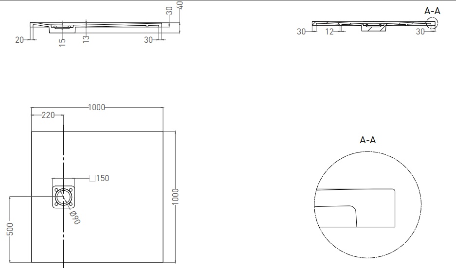 100 x 100 x 3,0 см. Материал: каменная масса S-Stone, цвет белый матовый (варианты RAL). Комплектация: поддон, сифон.