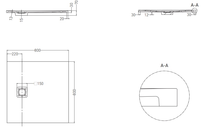 80 x 80 x 3,0 см. Материал: каменная масса S-Stone, цвет белый матовый (варианты RAL). Комплектация: поддон, сифон.