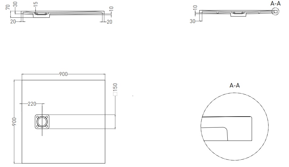 90 x 90 x 3,0 см. Материал: каменная масса S-Stone, цвет белый матовый (варианты RAL). Комплектация: поддон, сифон.