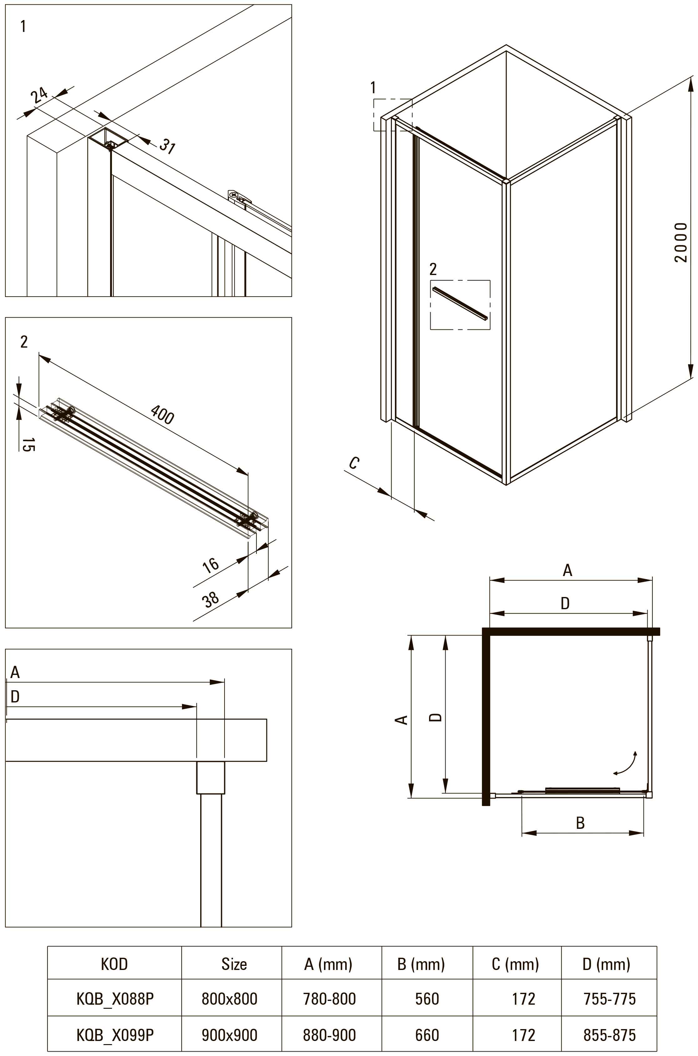 Квадратная 90х90х200 см с раздвижной внутрь дверцей, без поддона. Закалённое стекло 6 мм прозрачное, водоотталкивающее покрытие. Профиль - титан
