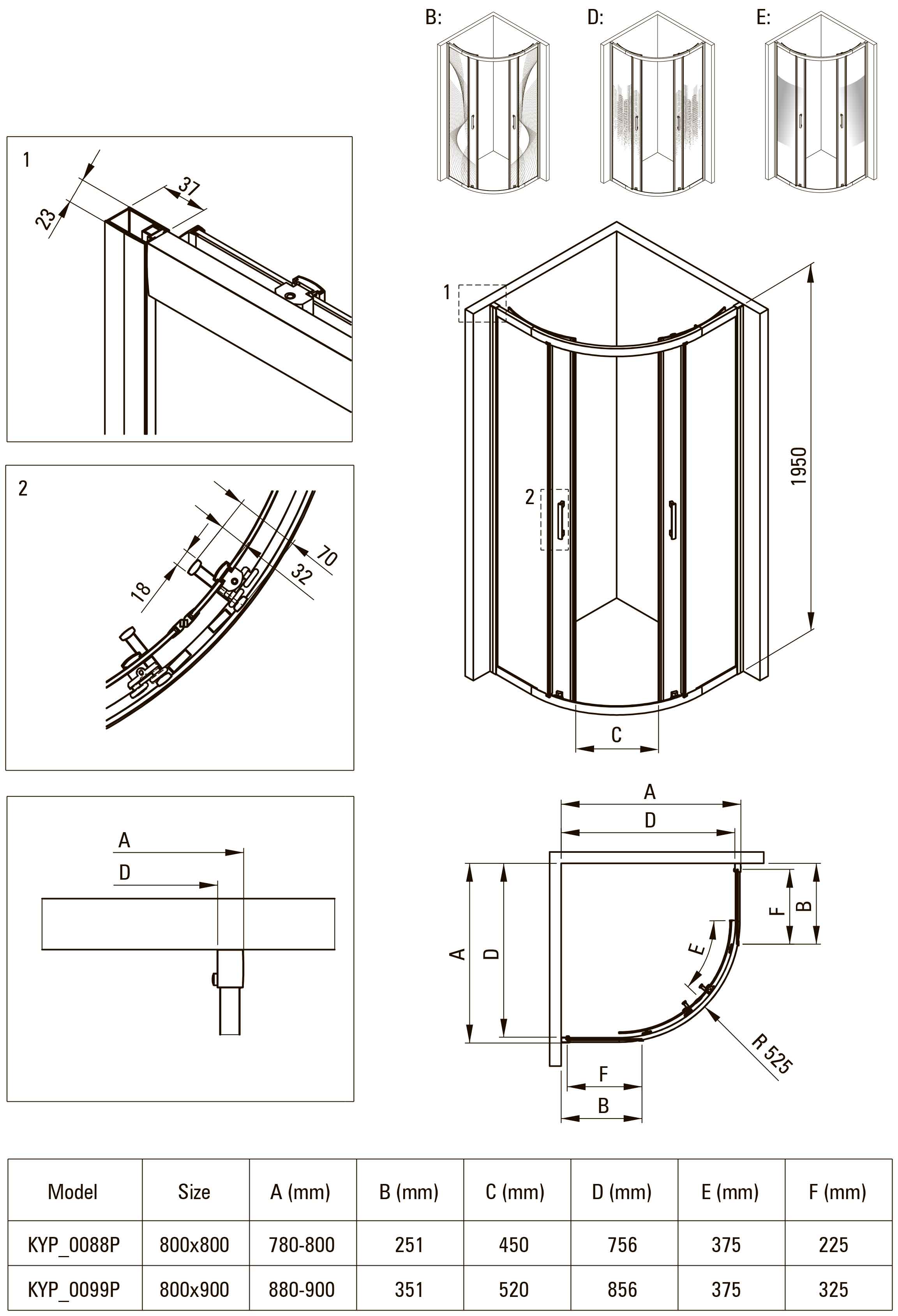 Полукруглая 90х90х195 см с раздвижными створками, без поддона. Закалённое стекло 5 мм прозрачное. Двери на подшипниковых роликах. Профиль: хром.