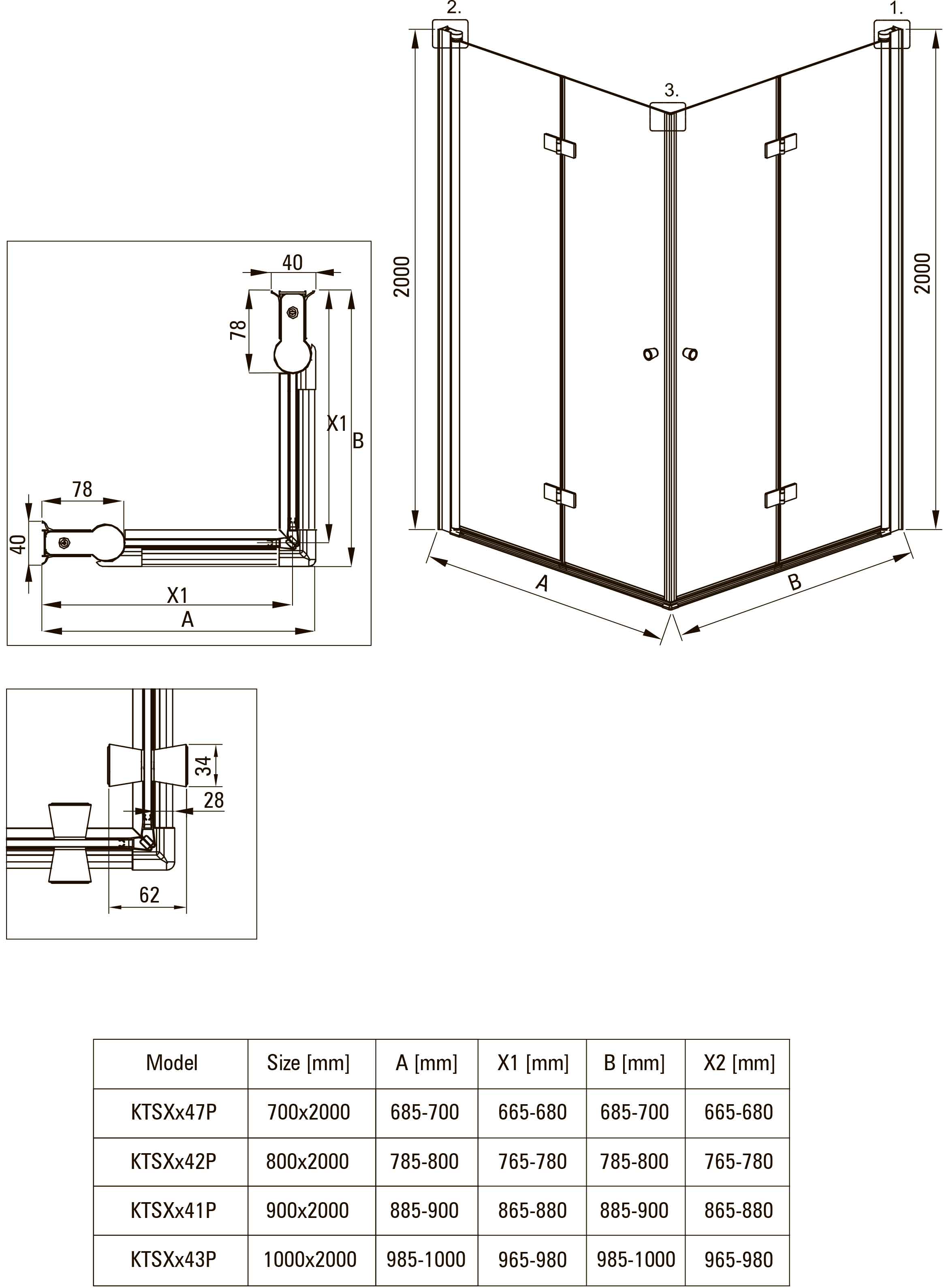 Квадратная 90х90х200 см с 2-мя складывающимися внутрь дверцами, без поддона. Закалённое стекло 6 мм прозрачное, водоотталкивающее покрытие. Двери с подъемными петлями.