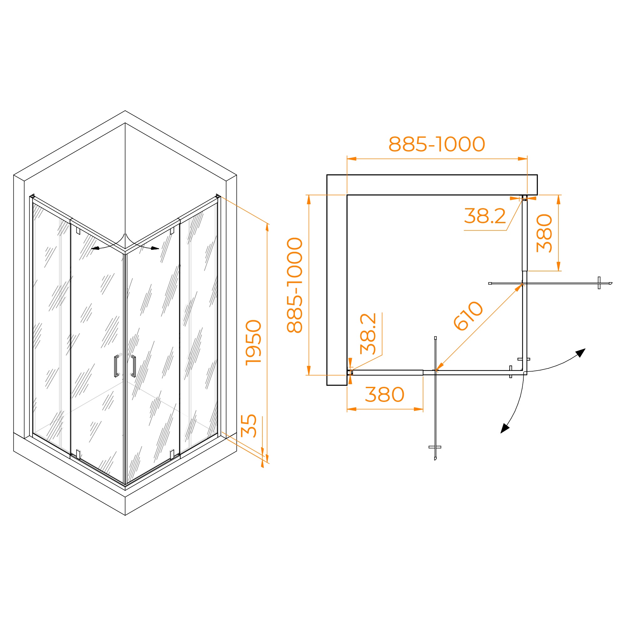 Душевой угол квадратный 90х90х195 мм. Распашные двери. Закаленное безопасное стекло 6 мм. Прозрачное, Easy Clean. Профиль алюминиевый: Черный.