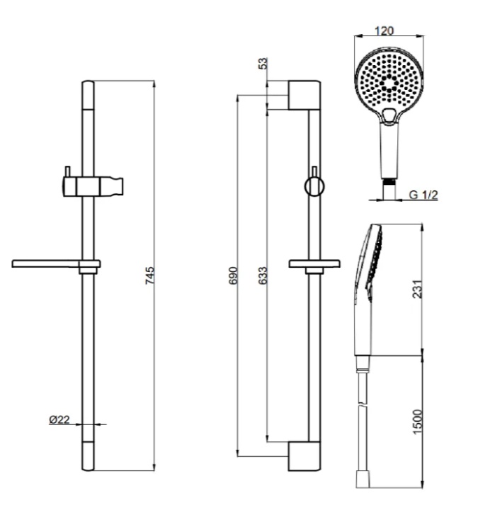 Ручной душ на 3 типа струи, штанга 70 см, хромированный пластик. Силиконовый шланг 150 см. Цвет: хром.