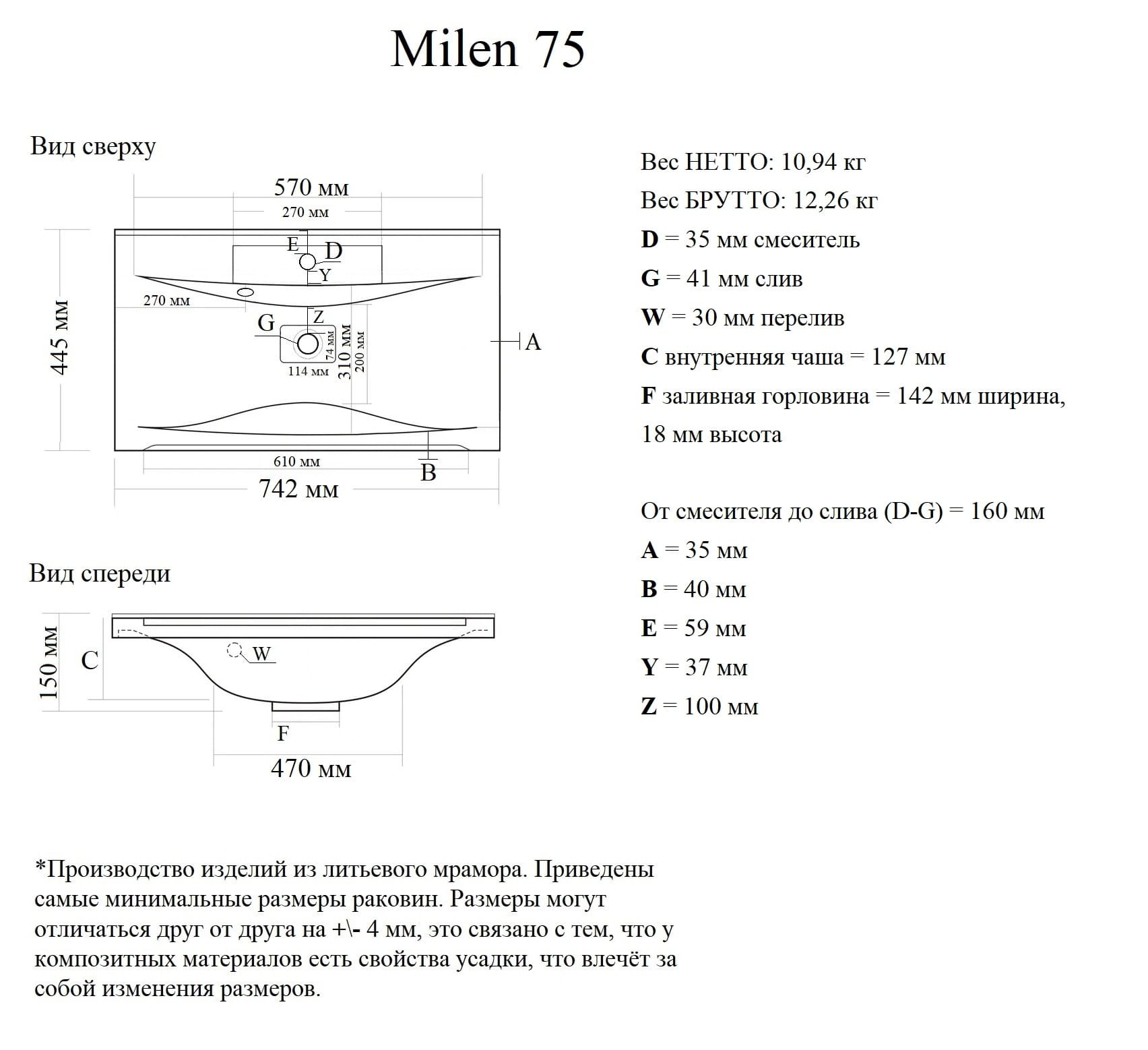 75 х 42 х 50 см (ш/г/в), Тумба навесная. Под умывальник каменный Andrea Elen 75 х 45 см, в комплект не входит. Материал: ДСП/МДФ крашенный, Цвет - Белый.