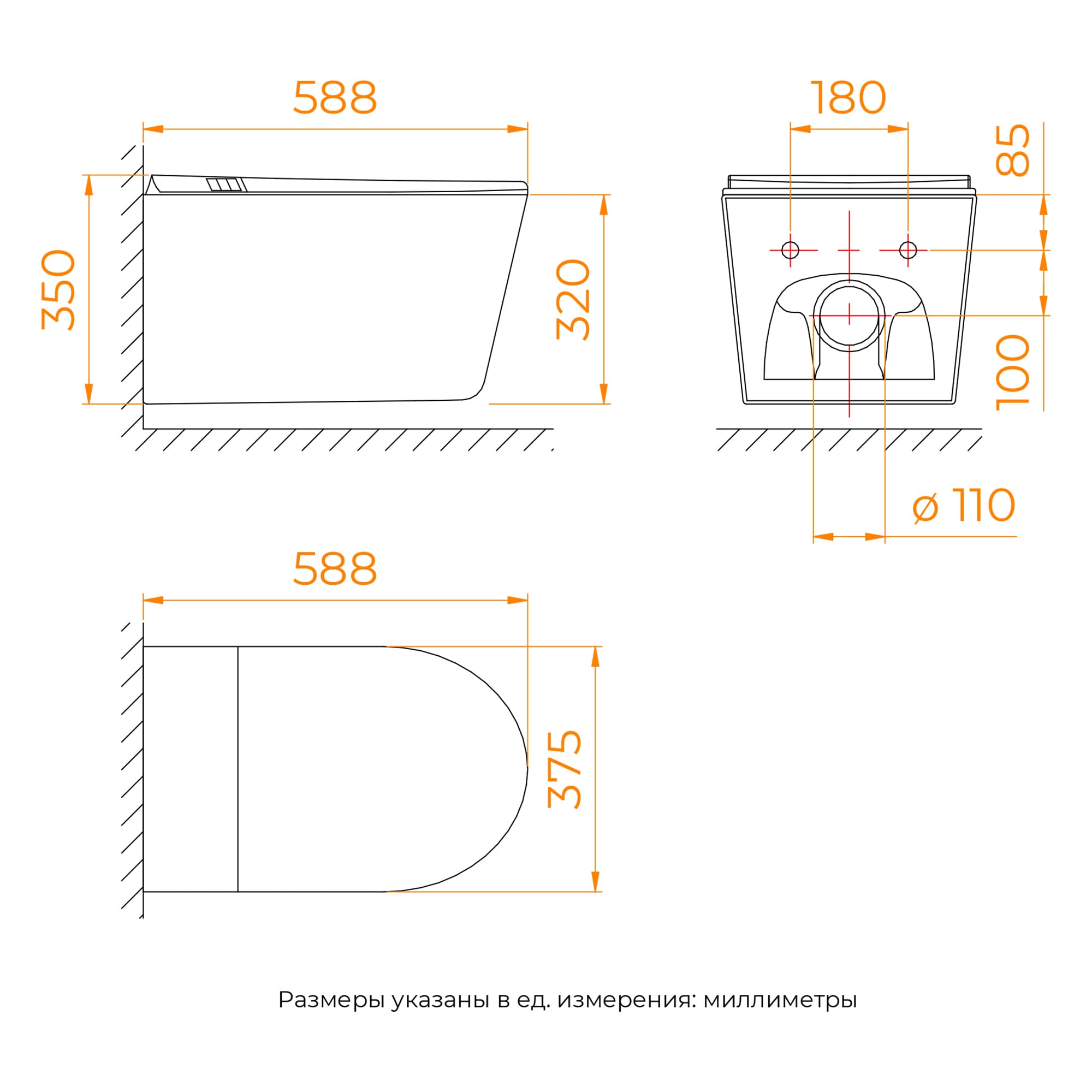 375 х 588 мм, безободковый торнадо, с импульсным смывом, пульт, подогрев, биде.