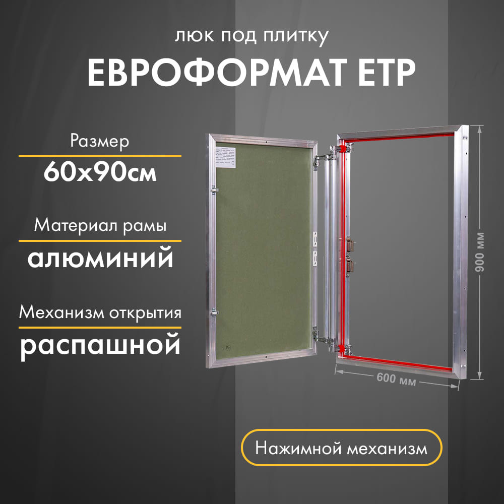 Люки серии Евроформат ЕТР устанавливаются внутри помещений в вертикальные стены из любых материалов и обеспечивают доступ к сантехническим и любым другим инженерным коммуникациям. К особенностям также можно отнести то, что при облицовке дверцы плиткой, наклеенная плитка может выступать за габариты дверцы, что исключает необходимость ее подрезки при наклеивании на дверцу люка.