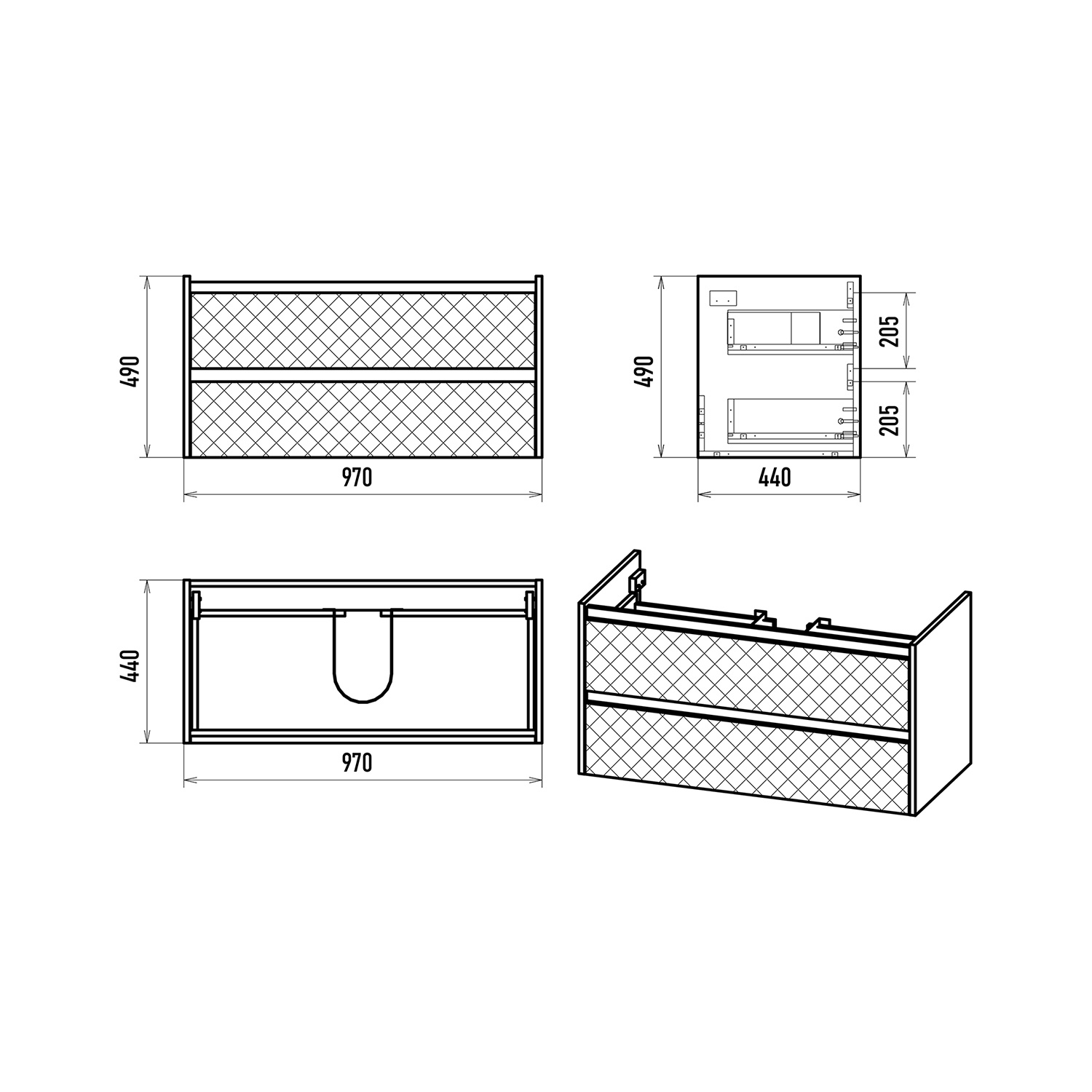 97,0x44,0x49,0 см (ш/г/в). Подвесной монтаж. Корпус: ЛДСП, МДФ. Фасад: ЛДСП. Цвет: Серый / Дуб Чарльстон темно-коричневый. Умывальник в комплект не входит.