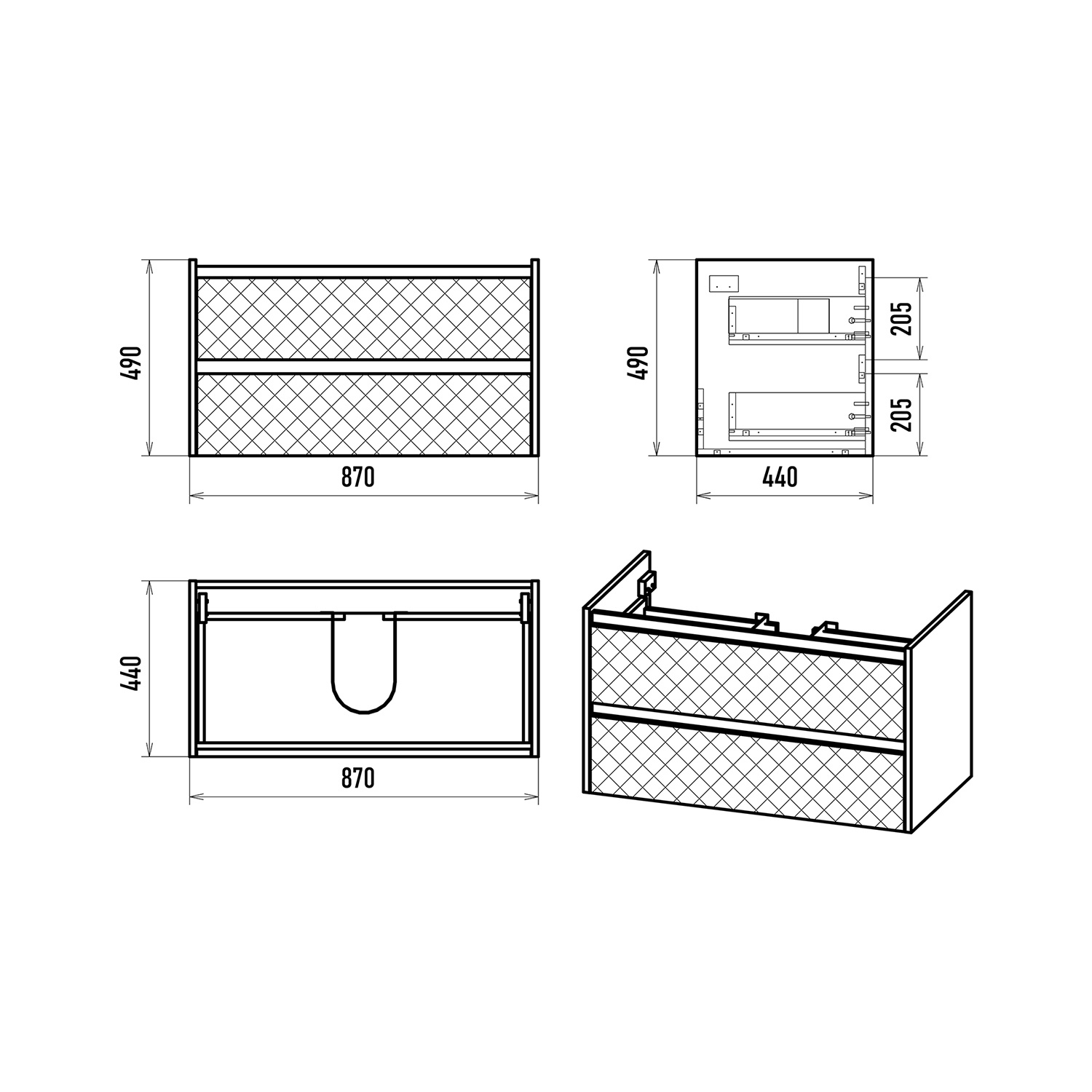 87,0x44,0x49,0 см (ш/г/в). Подвесной монтаж. Корпус: ЛДСП, МДФ. Фасад: ЛДСП. Цвет: Серый / Дуб Чарльстон темно-коричневый. Умывальник в комплект не входит.