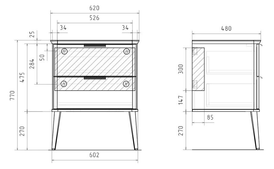 62,0х48,0х50,0 см (ш/г/в). Подвесной/ напольный монтаж. Корпус: МДФ. Фасад: МДФ. Цвет: Амарок/Дуб. Умывальник в комплект не входит.