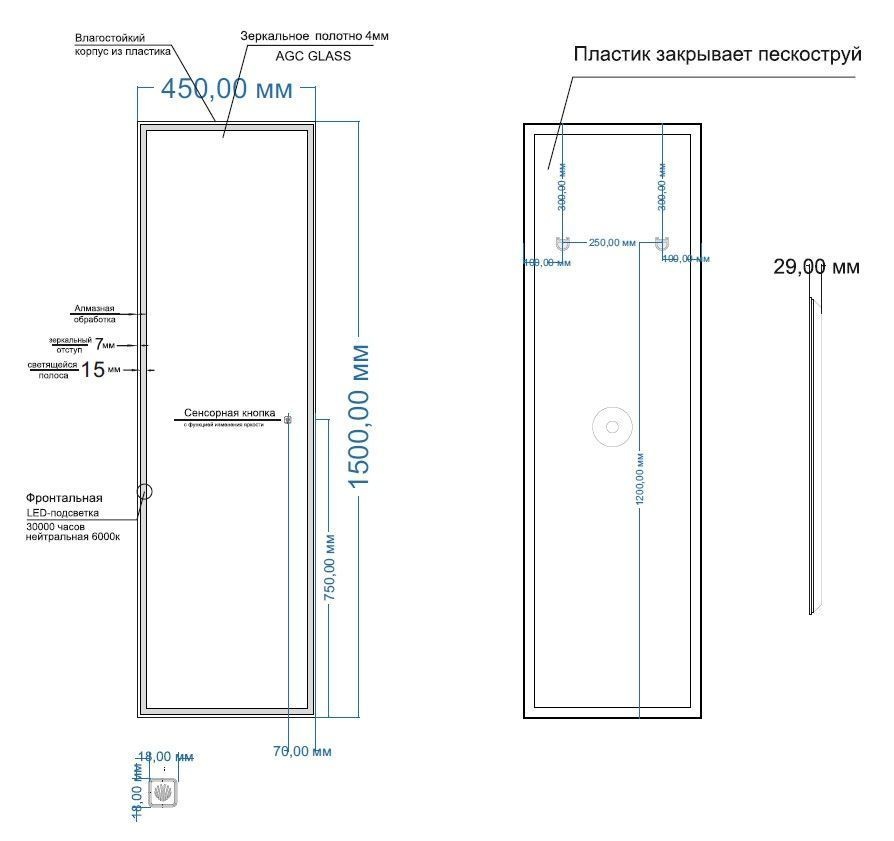 45 х 150 х 2,9 см (ш/в/г). Зеркало прямоугольное, светодиодная подсветка, без подогрева, сенсорное включение. LED 220V.