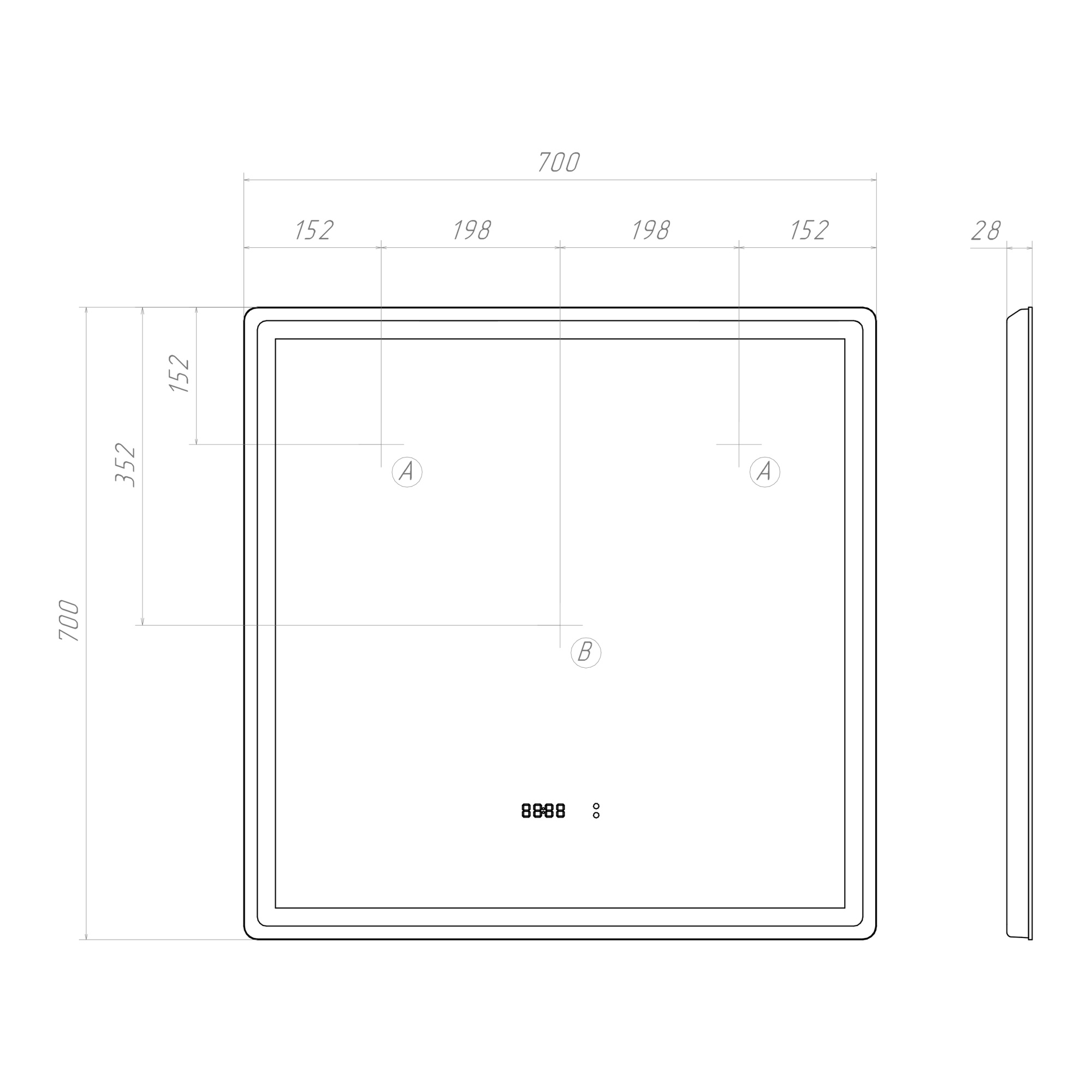 70 х 70 см (ш/в). Бесконтактное включение (на взмах), светодиодная подсветка, встроенные часы, датчик температуры, функция антизапотевания, диммер. Корпус - ABS пластик.