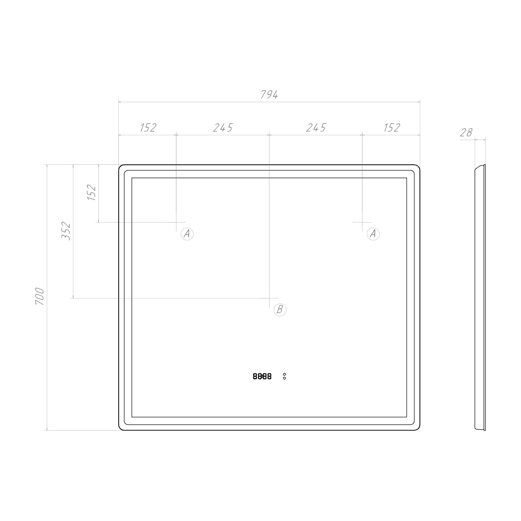 80 х 70 см (ш/в). Бесконтактное включение (на взмах), светодиодная подсветка, встроенные часы, датчик температуры, функция антизапотевания, диммер. Корпус - ABS пластик.