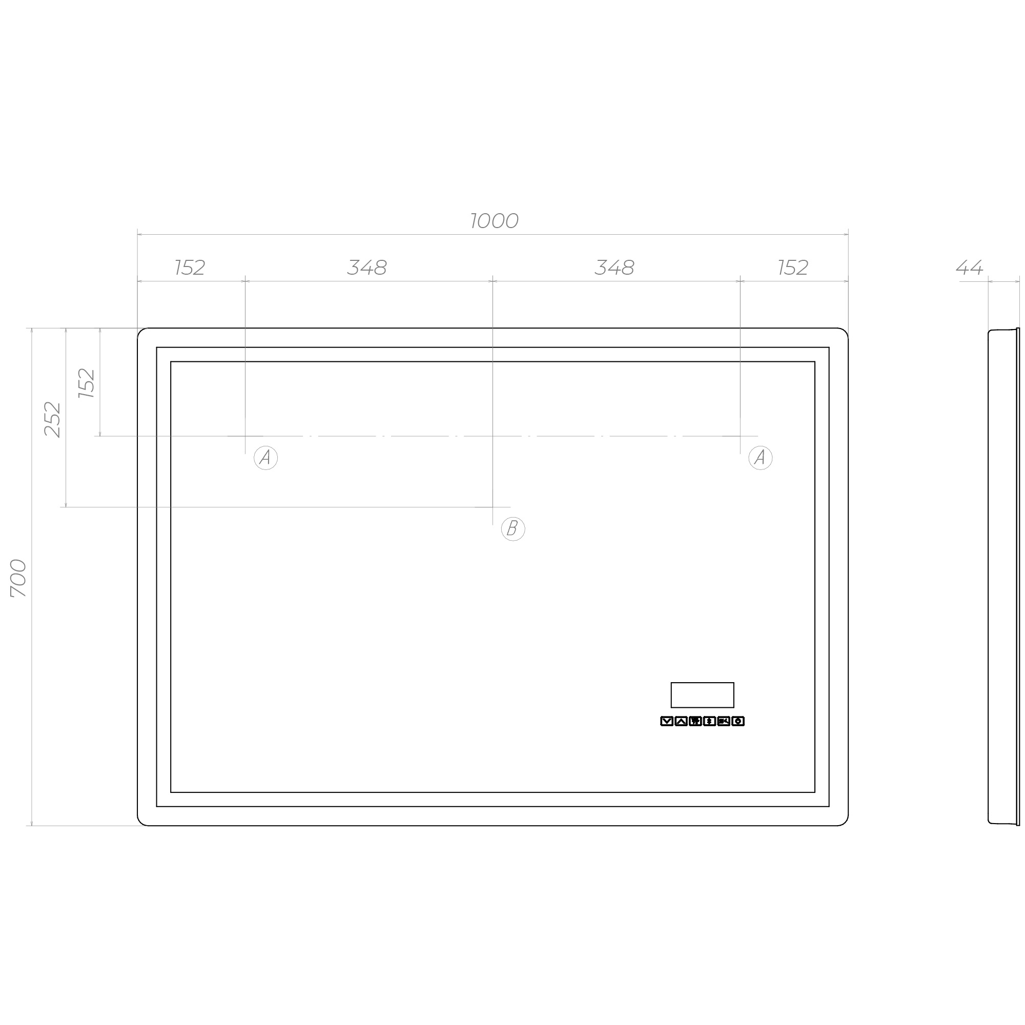 100 х 70 см (ш/в). Голосовое и сенсорное управление, календарь, встроенные часы, датчик температуры воздуха, медиа-блок Bluetooth, USB, светодиодная подсветка, подогрев. Корпус - ABS пластик.