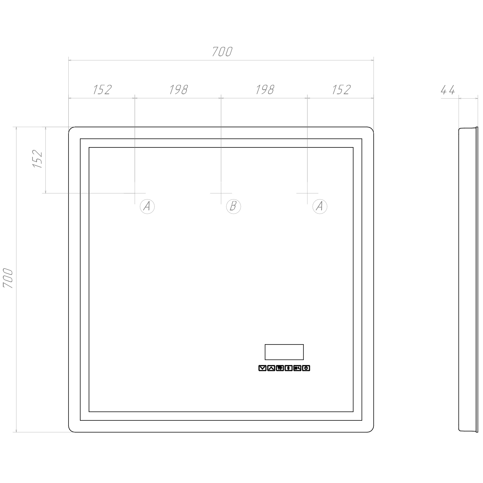 70 х 70 см (ш/в). Голосовое и сенсорное управление, календарь, встроенные часы, датчик температуры воздуха, медиа-блок Bluetooth, USB, светодиодная подсветка, подогрев. Корпус - ABS пластик.