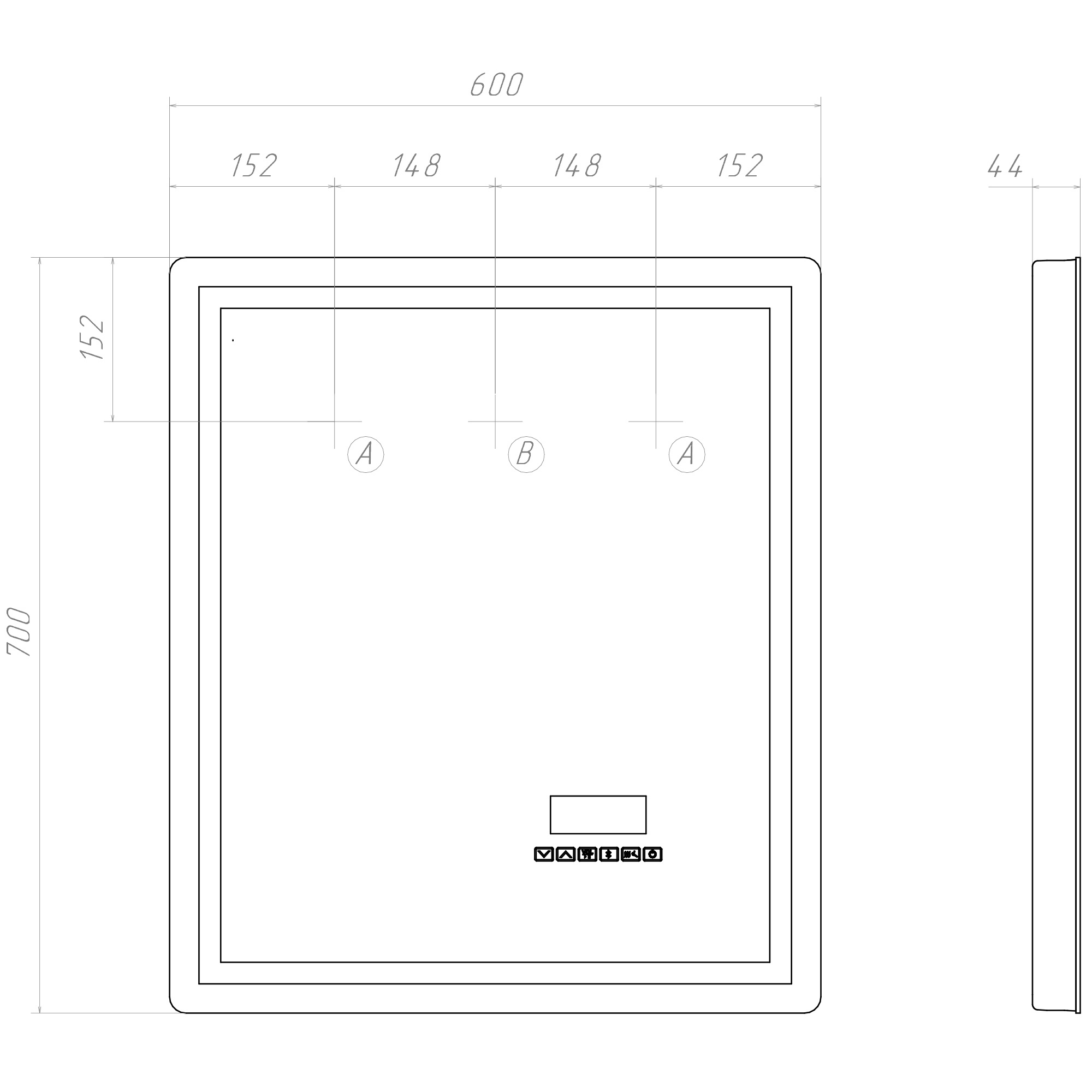 60 х 70 см (ш/в). Голосовое и сенсорное управление, календарь, встроенные часы, датчик температуры воздуха, медиа-блок Bluetooth, USB, светодиодная подсветка, подогрев. Корпус - ABS пластик.