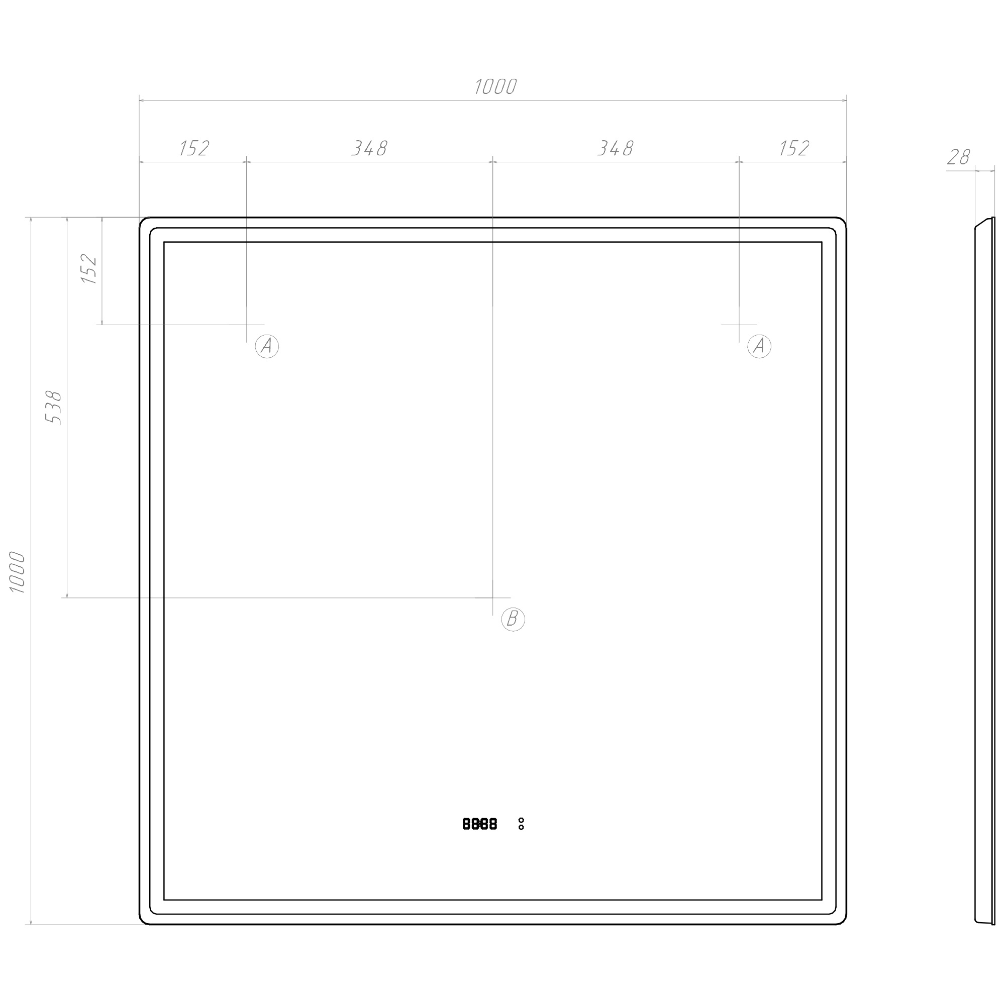 100 х 100 см (ш/в). Бесконтактное включение (на взмах), светодиодная подсветка, встроенные часы, датчик температуры, функция антизапотевания, диммер. Корпус - ABS пластик.