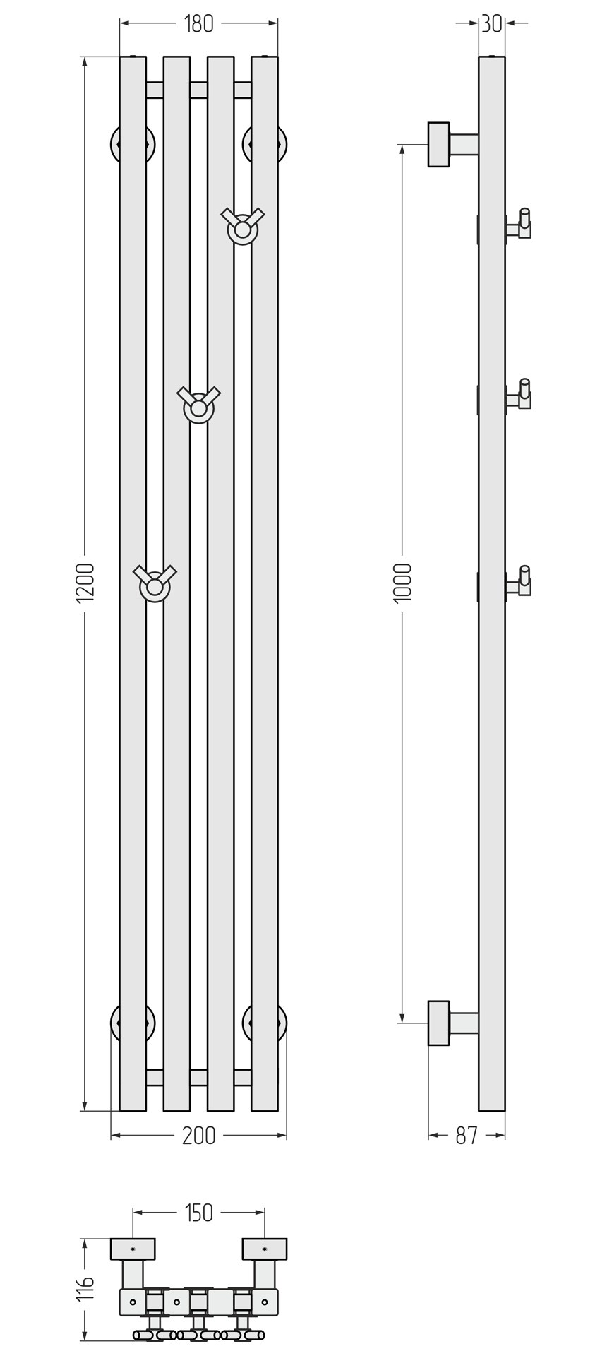 1200x200 мм. Подключение: горизонтальное. Материал - нержавейка. Цвет- Сатин, возможны варианты другого цвета. Площадь, на которую рассчитано изделие: 8,1 м2. Полимерное покрытие изнутри.