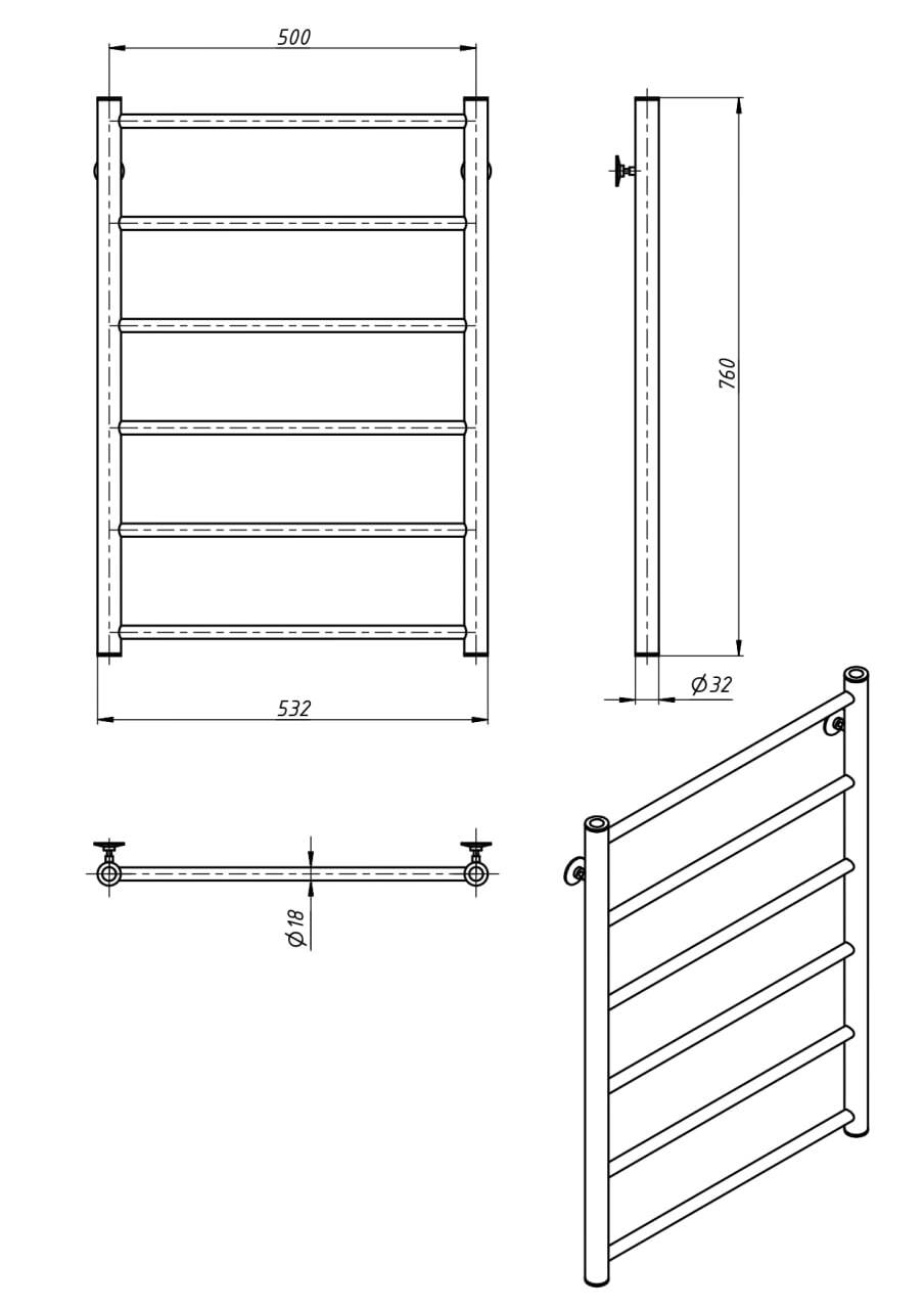 500x760 мм. Подключение нижнее: 500 мм внутреннее 1/2". Материал - нержавейка. Количество перемычек - 6. Цвет- хром. Полимерное покрытие изнутри.