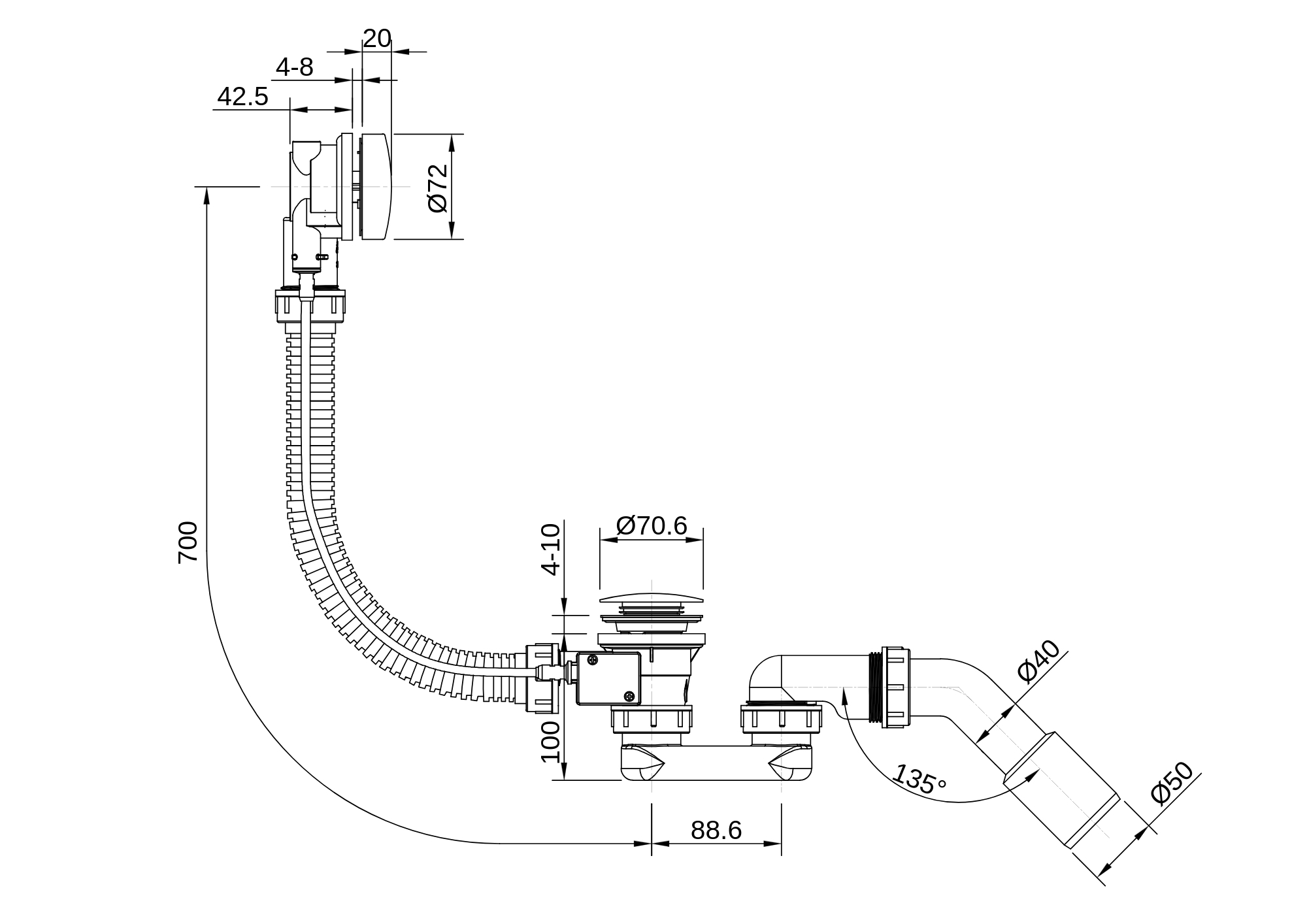 Сифон-обвязка для стандартных ванн. Длинна тросика 70 см. Материал: пластик/медь. Цвет-хром