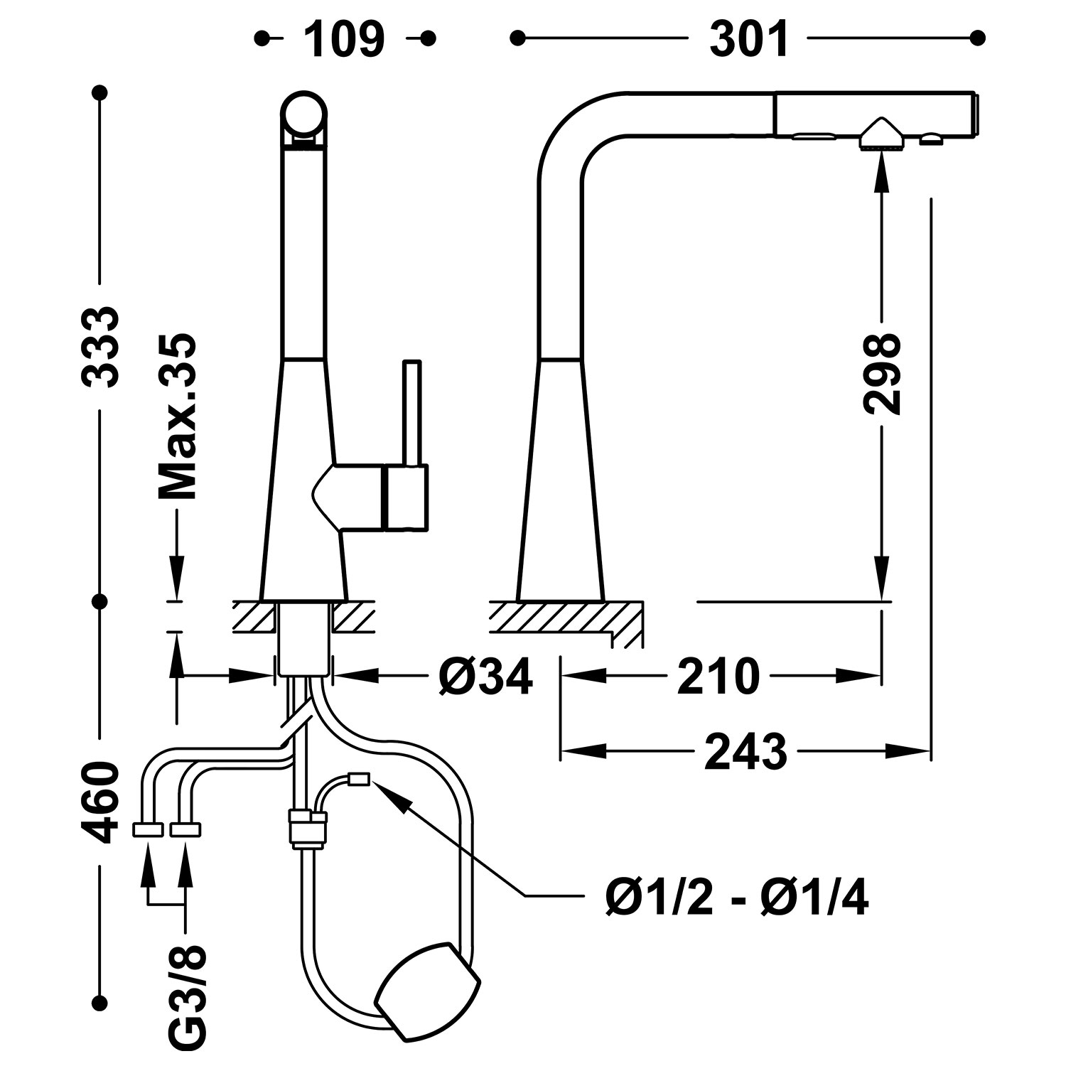 Смеситель для кухни Tres 23045304 с одним рычагом и двумя источниками воды, с выдвижным носиком для подключения к водопроводу и фильтрованной воде,