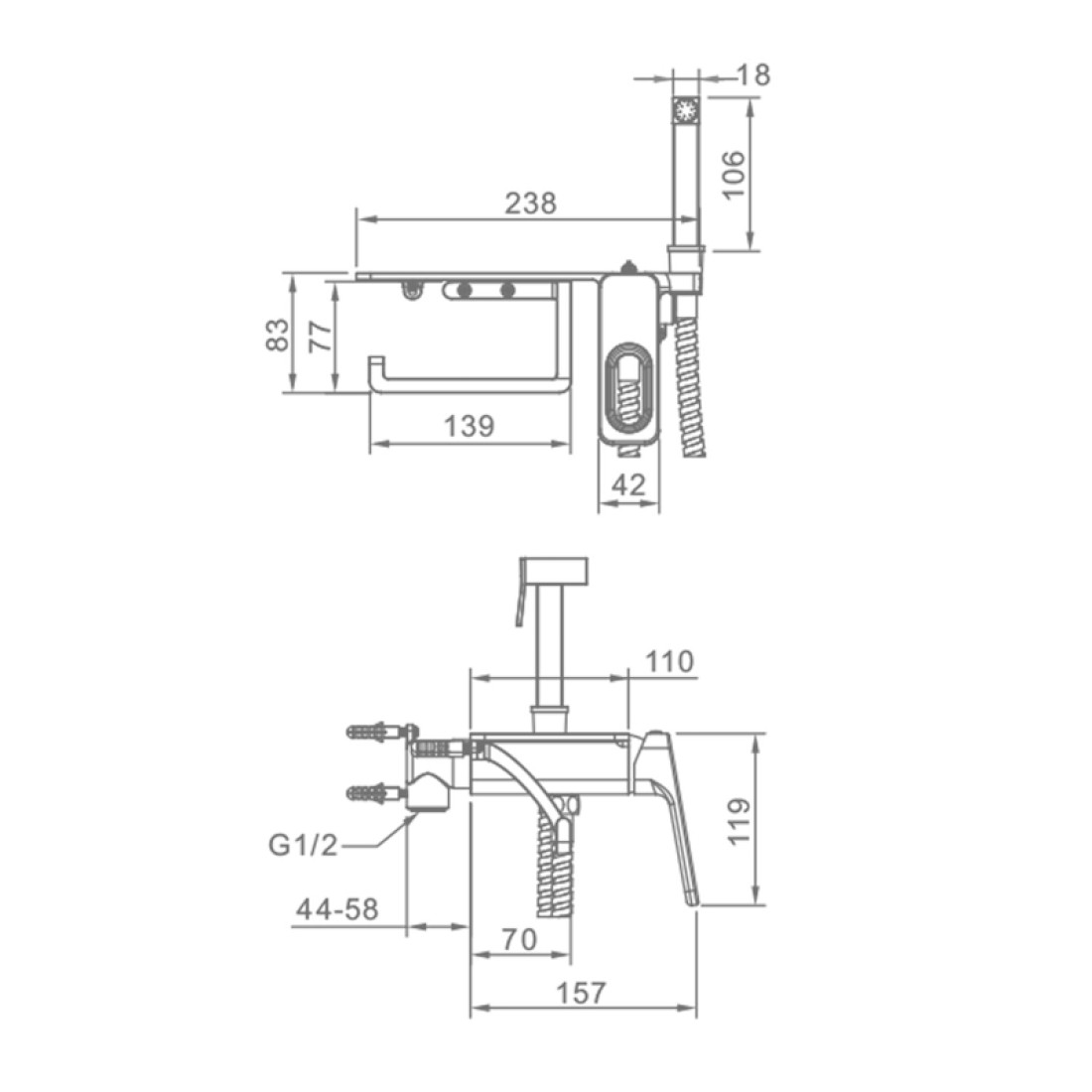 Смеситель в комплекте с скрытой частью, Шланговое подсоединение с держателем в корпусе смесителя, полка, держатель бумаги. Гигиеническая лейка 1 режим, Шланг для душа 1,2 м. Цвет: хром.